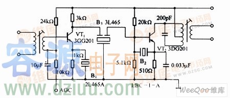 陶瓷濾波器收音機(jī)中放電路 如圖所示為兩端及三端陶瓷濾波器在調(diào)幅半導(dǎo)體收音機(jī)中放電路中的應(yīng)用。陶瓷濾波器B1和B2用于465kHz中頻旁路,B1則用于中頻的耦合。B1使用窄帶型濾波器,它并聯(lián)在VT1的發(fā)射極電阻上,有