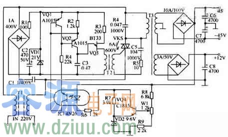 如圖所示為性能優越功放電源的電路。它具有體積小、功率大、效率高的特點。 工作原理:交流電源輸入經T1進行濾波后分成兩路輸出,一路去降壓變壓器T3,在T3的初級回路中串人了雙向晶閘