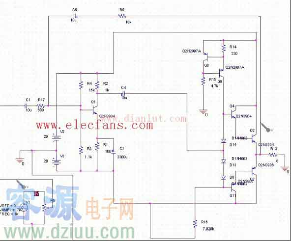 功率放大器電路是使用雙20V電壓電源,提供15W的不失真功率在8歐姆負(fù)載的時候。Q1 經(jīng)營在共同的放射器, 輸入信號通過對偏壓管子包括Q8, Q9 、D6 、D13 和D14 。Q8 和Q9 提供恒流偏壓, 產(chǎn)品階段減到最小由分離darl
