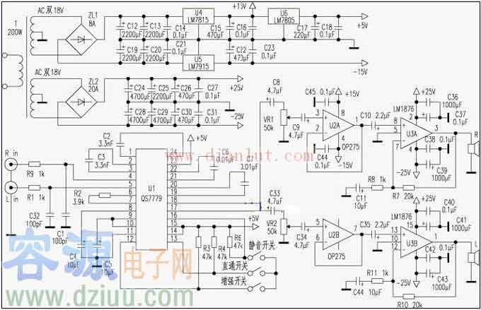 LM1875T聲道有源音箱功放電路