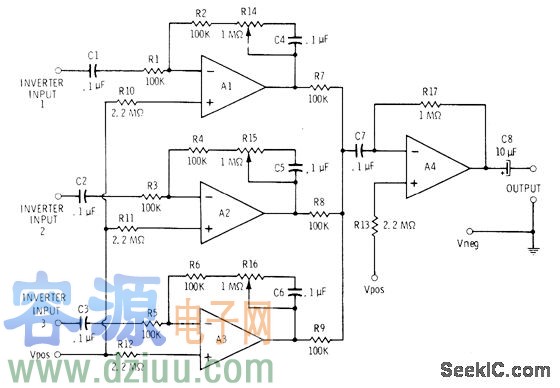 摩托羅拉MC3401P或美國國家公司的LM3900四運(yùn)算放大器用于三個(gè)輸入放大器。每個(gè)輸入放大器具有1到11的可調(diào)增益范圍,輸入抗阻大約在100000歐姆以上。通用輸出傳送四運(yùn)算放大器部分,該運(yùn)算放大器部分被作為高阻抗放