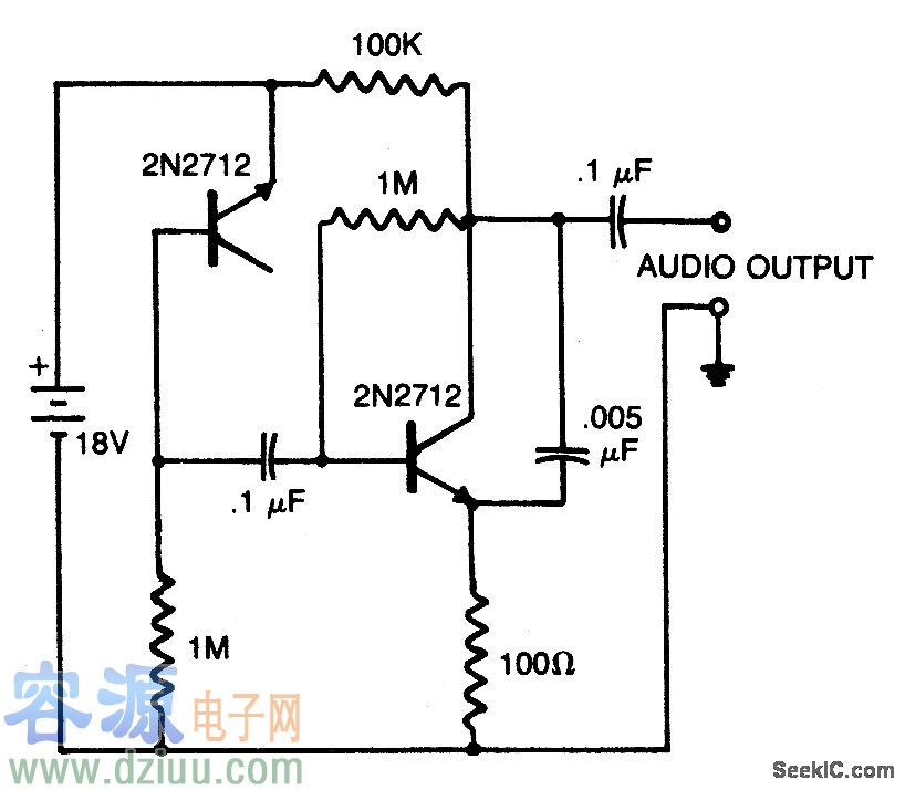 2N2712晶體管的反轉偏置NPN結用于噪音發生器。第二個2N2712是一個音頻放大器。流經放大器輸出的0.005μF電容器消除了一些高頻成分以便更接近模仿粉紅噪音。為了揚聲器聆聽,音頻輸出可能連接到高阻抗的耳機或者驅