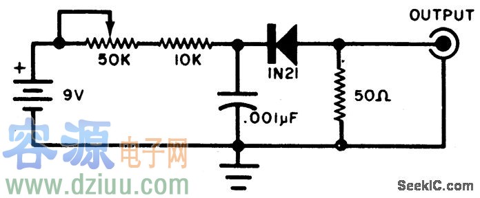 該電路產生寬帶RF噪音。它利用反轉偏置二極管并且具有低阻抗輸出。它能用來調整接收器到最佳狀態。 :