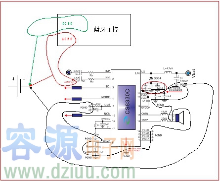 電路板上所有的器件以及單元電路都是以地線作為參考電位。原理上地線作為零電位,器件之間不會產生由于地線的耦合干擾。但實際是不可能的,所有引線都具有阻抗,只要地線有電流流過,就會產生相應的壓降。電路走線還會形成電感,這意味著電流從電源正極流向負載,然后返回電源負極,在整個電流通道上存在一定的電感。工作在較高頻率時,電感將增大地線阻抗,比如DC-DC升壓電路中電源-電感-MOS管-地通路。如果不分地,特別整個地平面不完整,音頻功放信號又是單端輸入的情況下,數字電路以及升壓電路的開關噪聲就會通過地線耦合到音頻功放的輸入端或者電源端,最終喇叭輸出明顯的底噪聲。所以分地是一個處理底噪聲的好辦法。以內置升壓音頻功放CS8330用于藍牙音箱為例,可將整個PCB板地線分成三部分:DGND, PGND, AGND。DGND是主控數字電路部分,包括藍牙射頻部分地線可跟數字地接一起。PGND主要是音頻功放DC-DC升壓部分以及功率放大部分,包括外圍的濾波電容。充電部分可在功放的前端接一起,也可單獨一部分。AGND包括藍牙主控芯片ADC, DAC,MIC部分模擬地以及音頻功放內部輸入端預放部分模擬地。最終DGND,PGND,AGND三大塊在電池或者電源輸入端匯總一點接地。如下圖所示: