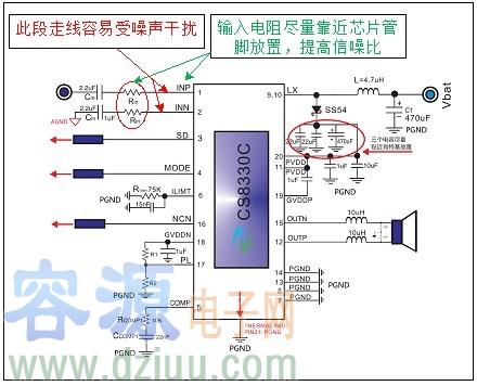 (3). 音頻信號輸入采樣電阻盡量靠近功放芯片管腳放置。