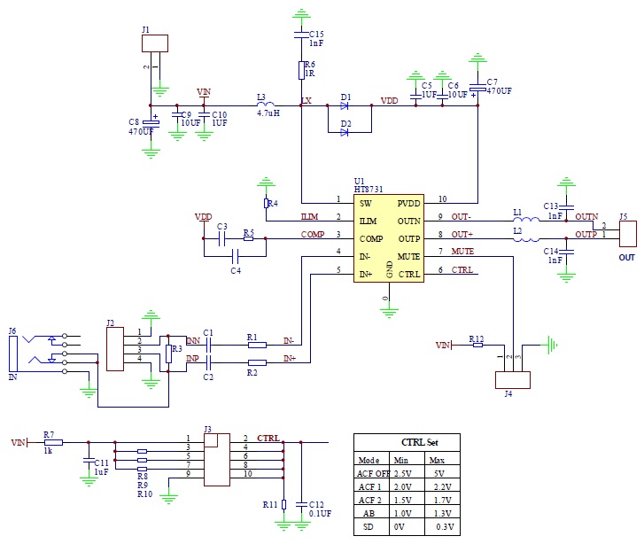 HT8731的最大特點是防削頂失真(ACF)輸出控制功能,可檢測并抑制由于輸入音樂、語音信號幅度過大所引起的輸出信號削頂失真(破音),也能自適應地防止在BOOST升壓電壓下降所造成的輸出削頂,顯著提高音質,創造非常舒適的聽音享受,并保護揚聲器免受過載損壞。HT8731提供兩種不同音樂體驗的ACF模式,以及ACF-Off 模式。