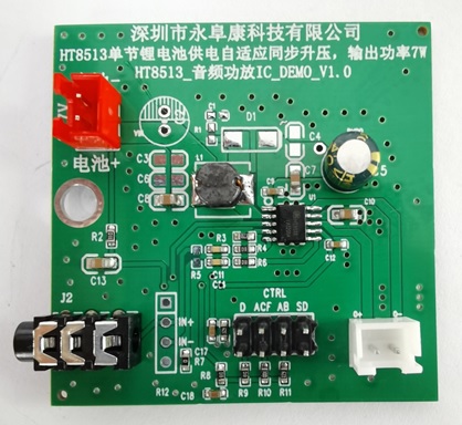 深圳市永阜康科技有限公司針對(duì)便攜式藍(lán)牙音箱以及4寸、6寸手提戶外音箱的應(yīng)用需求,推廣一款單節(jié)鋰電池供電內(nèi)置動(dòng)態(tài)同步升壓5W單聲道音頻功放IC-HT8513。HT8513相比同類競品有三大優(yōu)勢:一是采用高效率的同步升壓,相比非同步效率提高5%,并且外圍不需要肖特基二極管,外圍升壓采用小電感,PCB面積也更小,整機(jī)成本更低;二是動(dòng)態(tài)升壓,芯片內(nèi)部自動(dòng)檢測輸入音頻信號(hào)大小,小信號(hào)不升壓,大信號(hào)自動(dòng)升壓,極大延長鋰電池的續(xù)航時(shí)間(尤其是中小音量播放時(shí)測試,相對(duì)恒定升壓音頻功放播放時(shí)間延長15%以上);三是相比電荷