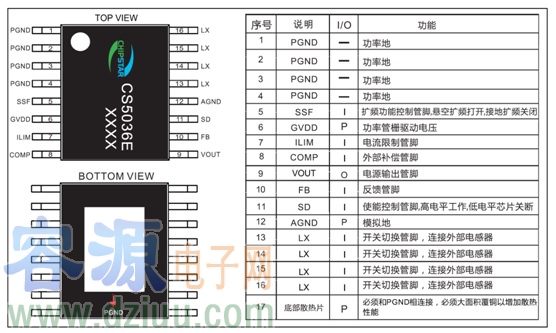 CS5036E是一款內置12A,MOS高效DC-DC升壓轉換芯片。外圍極其簡潔,輸入電壓范圍寬3V~12V,效率高達93%以上。限流值外圍可調,方便匹配電池。采用EQA16封裝,具備過溫保護,過壓保護等功能。
