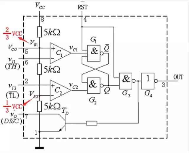 它內(nèi)部包括兩個電壓比較器,三個5K等值串聯(lián)電阻,一個 RS 觸發(fā)器(由G1和G2構(gòu)成),一個放電三極管T 及功率輸出級。它提供兩個基準電壓VR2(1/3 VCC) 和VR1(2/3 VCC),如下圖所示。