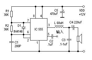 由IC 555和R1、R2、C1等組成100KHz可控多諧振蕩器,占空比為50%,控制端5腳輸入音頻信號,3腳便得到脈寬與輸入信號幅值成正比的脈沖信號,經L、C3接調、濾波后推動揚聲器。