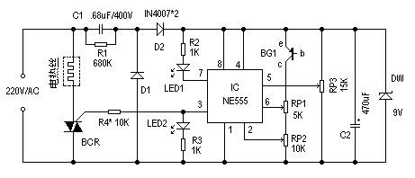 電路如圖所示。圖中IC為NE555時基電路。RP3為溫控調節電位器,其滑動臂電位決定IC的觸發電位V2和閥電位Vf,且V5=Vf=2Vz。220V交流電壓經C1、R1限流降壓,D1、D2整流、C2濾波,DW穩壓后,獲得9V左右的電壓供IC用。室溫下接通電源,因已調V2Vz,V6≥Vf時,IC翻轉,3腳變為低電平,BCR截止,電熱絲停止發熱,溫度開始逐漸下降,BG1的ICEO隨之逐漸減小,V2、V6降低。當V6元件選擇: