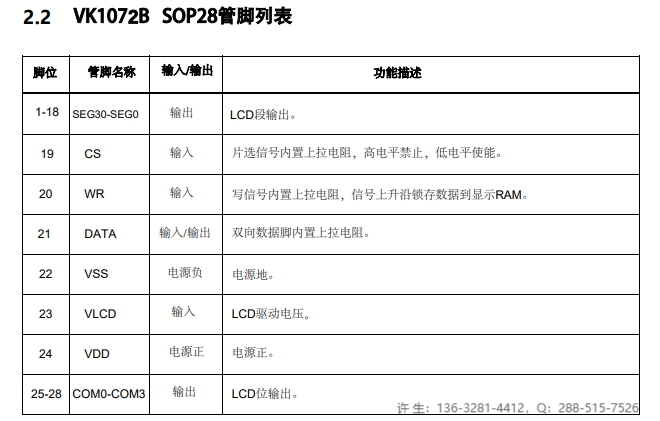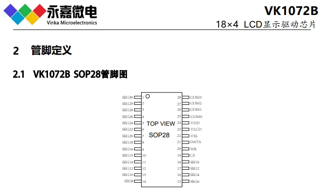 VK1072B 2.4V~5.2V 18seg*4com 18*3 18*2 偏置電壓1/2 1/3 SOP-28