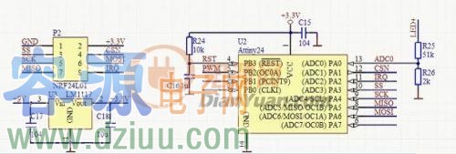 控制信號通過P2送進單片機,U3為單片機工作提供穩定的3.3V電壓。ATtiny24的主要工作是根據控制信號, 在PB2引腳輸出相應的PWM信號,R25和R26對輸出電壓分壓,PA0通過ADC采樣輸出電壓。 單片機輸出的PWM信號經過下面的濾波電路得到輸出穩定的電壓信號。