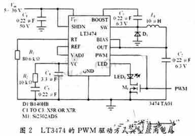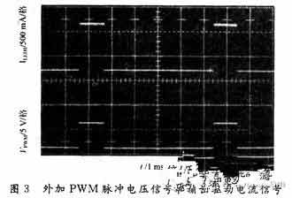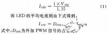 圖3所示為在PWM調(diào)節(jié)方式下,外加PWM脈沖驅(qū)動(dòng)信號(hào)和輸出驅(qū)動(dòng)電流的測(cè)量結(jié)果。從圖3中可以清楚地觀察到LED驅(qū)動(dòng)電流是受外加PWM信號(hào)的控制。其中REF管腳的輸出參考電壓為1.25 V,如果將VADJ與REF管腳短接,則輸出的額定LED驅(qū)動(dòng)電流為最大輸出電流(1 A)。對(duì)LED的額定驅(qū)動(dòng)電流JLED的調(diào)節(jié)是通過改變VADJ管腳的電壓而實(shí)現(xiàn),可以通過將REF所輸出的1.25 V參考電壓分壓而完成。輸出LED的額定電流由下式得到: