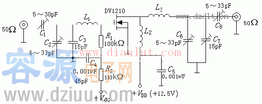 本電路是175MHz VMOS場效晶體管諧振功放電路,該電路功率增益10dB,效率大于60%,可向負載提供10W功率。 柵極采用并饋,漏極采用串饋。 柵極采用C1、C2、C3、L1組成的T形匹配網絡。 漏極采用L2、L3、C