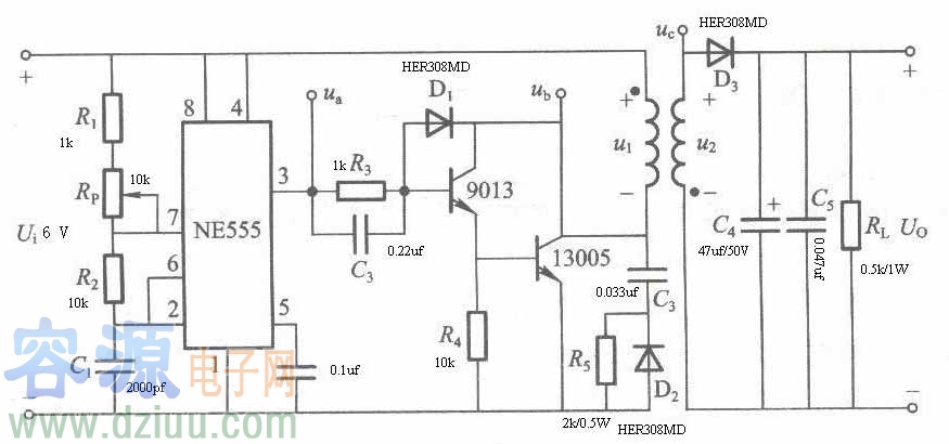 13005逆變電路圖:逆變器電路圖有很多種,采用不同的控制方式可以得到不同的電路及輸出功率及頻率,本文介紹的是用13005逆變電路圖,13005主要作用是功率開關管,13005決定輸出的功率(一般制作逆變器都希望輸出功率大更好)。電路前級主要是用NE555及13005控制,后級很簡單,就是整流加濾波得到直流電源。13005逆變電路圖如下: