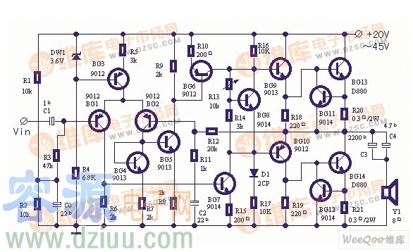 使用鏡像電路并帶輸出電流限制保護(hù)的實(shí)用功率放大器電路 :