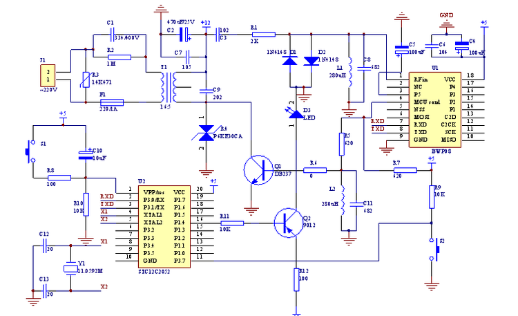 故障現象:做了一個單片機溫度監測系統,仿真機上一切正常,燒寫芯片無法工作。相關電路框圖: 用51做處理器,外圍電路如