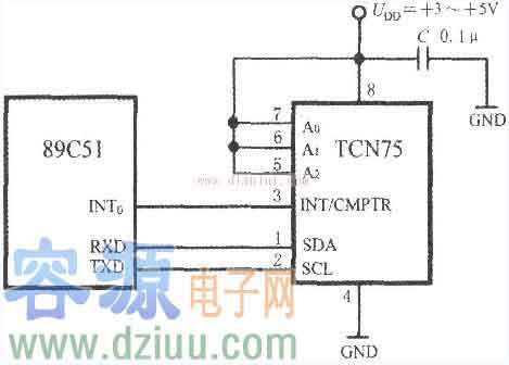 TCN75與89C51單片機的接口電路如圖所示。將TCN75的地址輸入端A2~A0均接上高電平UDD,設定地址碼為111.89C51通過軟件來實現片選功能。89C51的串行數據接收端(RXD)和串行數據發送端(TXD