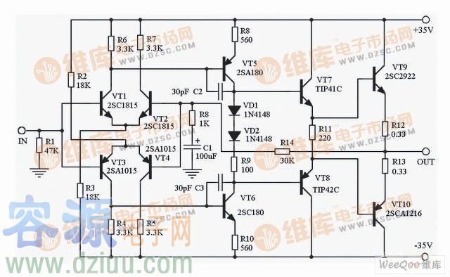 這個放大器使用雙20V電壓電源,提供15W的不失真功率在8歐姆負載的時候。Q1 經(jīng)營在共同的放射器, 輸入信號通過對偏壓管子包括Q8, Q9 、D6 、D13 和D14 。Q8 和Q9 提供恒流偏壓, 產(chǎn)品階段減到最小由分離darlington
