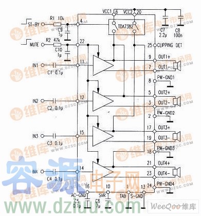 TDA7382 是意法半導(dǎo)體公司新推出不久的汽車用 AB 類功放集成電路,它采用 25 腳單列FLEXIW ATT 封裝。內(nèi)有 4 路22W PNP/NPN 互補(bǔ)晶體管構(gòu)成的橋式 AB 類音頻功率放大器,是高檔汽車?yán)硐氲亩嗦暤拦Ψ偶呻娐罚?