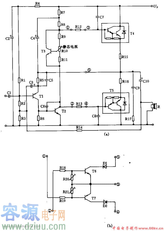 本電路全部采用分離元件制作,各元件取不同值可分別適應(yīng)25W、50W和100W的功率輸出。 如果將圖(a)中①~⑤各點間的電路用圖(b)電路部分代替,則可防止在控制信號過大或輸出短路時末級晶體管過載。當(dāng)超過由R20
