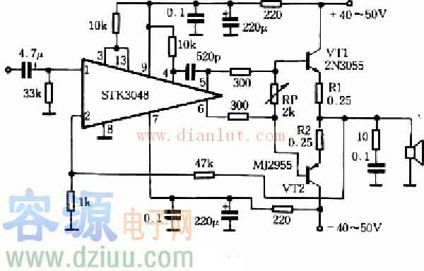 基于STK3048和STK6153的制作原理及應(yīng)用電路如圖。其線路的簡潔已經(jīng)達(dá)到上限。其中,R1和R2可以直接使用成品板上的。當(dāng)通電后如果管子不燙手并無其它異常的時候,就可以空載調(diào)整RP,使得R1、R2上的壓降為10~13m