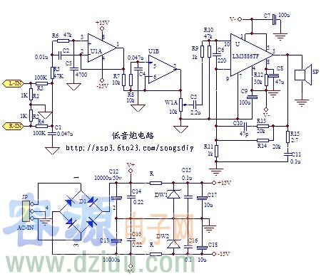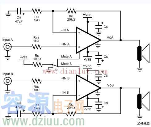 該20W+20W立體聲放大器由兩個完整而分立的20W RNS橋式放大器組成。輸入信號經(jīng)過R1、R2和P1(電位器)構(gòu)成的分壓網(wǎng)絡(luò)送入放大器。R1是信號源與地之間的負(fù)載阻抗,R2信號耦合到電位器P1。該信號由電容器C1到C2。