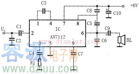 如圖所示,為0.5W單聲道OTL放大電路。 IC采用了OTL音頻功放集成電路AN7112.AN7112為單列9腳式封裝,②腳為音頻信號輸入端,⑥腳為功率信號輸出端,閉環(huán)電壓增益為50dB,滿功率輸出時輸入信號Ui=6mV,采用+6V單