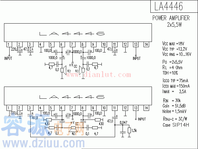 如圖所示電路開機(jī)沖擊極小。外接元件非常少。輸出功率大,Po=18W(RL=4Ω)。采用超小型封裝(TO-220),可提高組裝密度。能在最低±6V最高±22V的電壓下工作在±19V、8Ω阻抗時能夠輸出16W的有效功率,THD≤0.