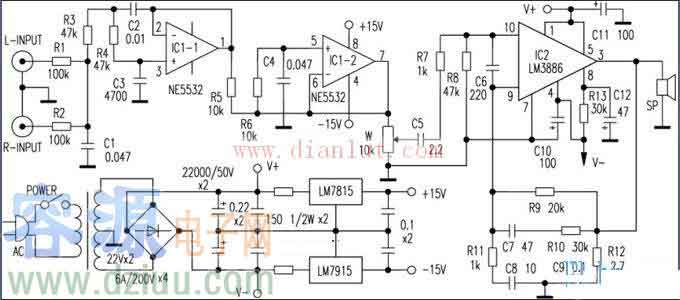 LM3886和NE5532設計的重低音功放電路原理圖