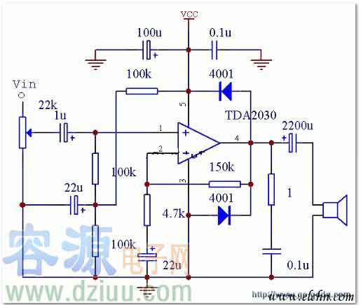 用TDA2030制作的有源功放電路圖示意圖