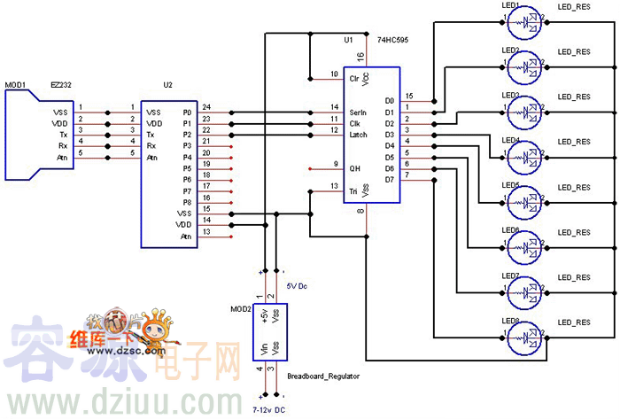 74HC595驅動LED電路圖如下所示: 歡迎轉載,信息容源電子網www.zskn.com.cn