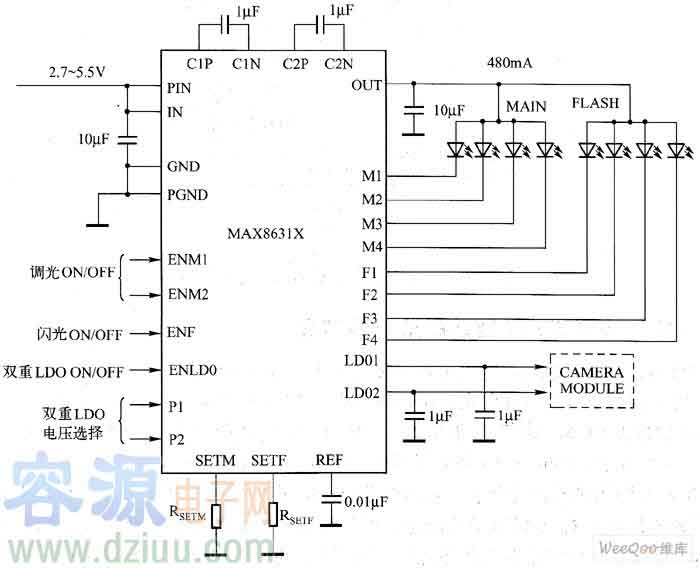 MAX8631X電荷泵能以恒定電流驅動多達8個白光LED,并獲得均勻的亮度。它能以高達30mA的電流驅動每個主屏白光LED(M1~M4),以用于背光。用于閃光燈的白光LED(F1~F4)是單獨控制的,MAX8631X能以高達100mA的電流
