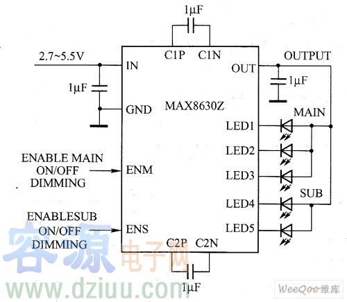 MAX8630Y/MAX8630Z電荷泵能夠以總計125mA的恒定電流驅動最多5個白光LED。利用自適應1倍壓模式、1.5倍壓模式電荷泵和超低壓差電流調節器,MAX8630Y/MAX8630Z可在單節鋰離子電池的有效電壓范圍內獲得較高的轉換效